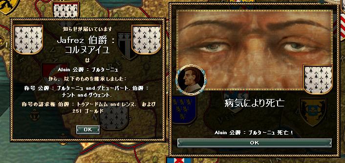 さて、軍事行動は一段落したので次は長男ジャフレズの嫁探しである。めぼしい者がいないかと各地を探しているうちに、アイルランドのトゥアードムム伯が破門されているのを発見。今すぐに侵攻する事はないだろうが、後々のために称号の請求をしておくことにした。