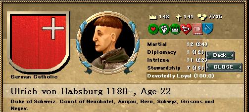 8代目Aarcau伯、初代Schweiz公Ulrich。 幼い頃にHabusburg家で初めてSchweiz公に叙任、晩年にはスイス統一に王手をかけたが、 そのために暗殺された人物は数知れず。