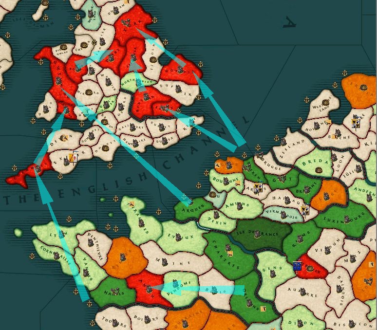 フランドル軍2万を主力としてロンドンに上陸、イングランド軍主力と交戦する ナントの軍は既にウェールズに向かっているアルク軍と合流してウェールズを制圧 アンジューはオルレアン軍が回収し、その他の軍は戦況に応じて領土の防衛や主力の増援を行う