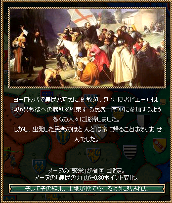 そして十字軍が宣言されてから20年が経過した1095年、ピエールなる隠者が農民たちを扇動し、何もせぬ諸侯に代わって聖地へ向かおうと提言する。