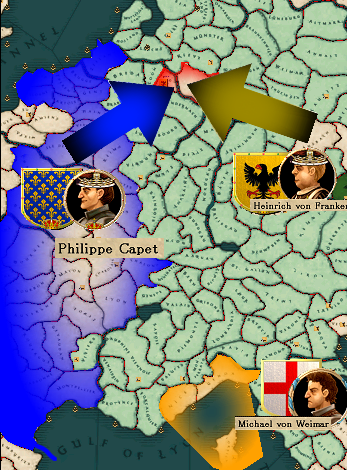 下Lorraine公Godfriedは下Lorraine公になって長かったが その統治はおおむね良好で、特に問題という問題がなかった。 ところが、1090年、Godfriedは狂気にとりつかれる。 統治能力を失ったGodfriedに代わり、廷臣たちが国を動かしていくことになる。 それに、Godfriedの妻やその息子たちが反発。 宮廷では一族と廷臣たちとの血みどろの争いが繰り広げられる。 これを好機とみたFrance王Philippe1世は「下Lorraineの仲裁」と称し、 下Lorraineの親France派伯爵らの協力を得ながら、下Lorraine公領に軍を進める。 当然、Germany王Heinrich4世はそのようなことを許すはずもなく、下Lorraine公領に軍を向ける。 こうして下Lorrainを舞台に親Germany王派、親France王派が入り乱れる独仏戦争が勃発する。