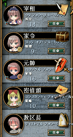 そしてこれが新しい宮廷メンバーだよ。先の元帥エレンフリート、母セシリー、教区長アドルフは寿命で亡くなっている。
