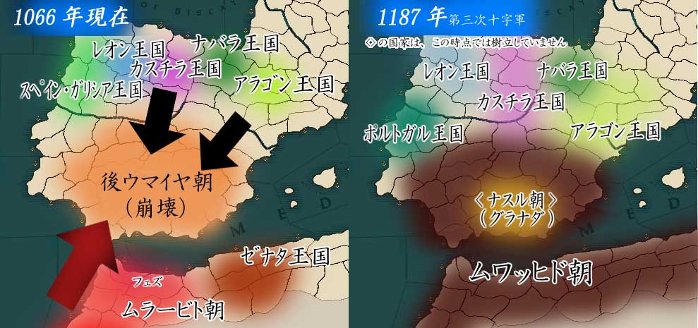 1066年現在、既に後ウマイヤ朝は政治的混乱の末崩壊しており、タイファと呼ばれる旧ウマイヤ朝の軍閥が独立して割拠しており統一した行動はとれなくなっていた。