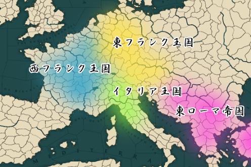 カール大帝の子のルイ敬虔王は817年、長男ロタールにイタリアを、次男ピピンにアクィタニアを、三男ルートヴィヒにバイエルンを任せた。ところが四男シャルルが生まれ、シャルルの母の実家のヴェルフェン家がシャルルにも領土を要求したことにより、フランク王国は内乱に陥った。内乱の末に生まれたのが、ロタールの子孫の中フランク王国、ルートヴィヒの子孫の東フランク(ドイツ)王国、シャルルの子孫の西フランク(フランス)王国である。中フランク王国はあまりに縦長だったため、北半分はドイツとフランスに併合され、南半分がイタリア王国として残りった。これが現在のイタリア、ドイツ、フランスの原型となった。東西フランク王国に併合された地は「ロタールの王国」の意でロートリンゲン(独)、ロレーヌ(仏)と呼ばれ、後々まで両国の係争地となった。