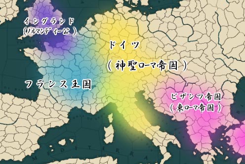 西暦962年オットー一世はローマ教皇により皇帝を冠されローマ皇帝となるが、帝位は世襲と諸侯たちの選挙という二重基準で行われるようになったため、皇帝の権威は高まらなかった。12世紀頃から東フランク王はドイツ王と呼ばれるようになり、そのドイツ王位と空位となったイタリア王位をローマ皇帝が占め、皇位継承者にはローマ王が与えられる慣習ができた。この東フランク(ドイツ)王国、ロートリンゲン王国、イタリア王国、を統べる帝国は当初ローマ帝国と呼ばれ、13世紀頃から神聖ローマ帝国と名乗るようになった。