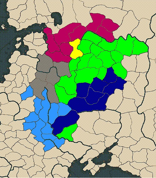 現在の勢力(赤:ノヴゴロド、灰:ポロツク、青:キエフ、紺:ブロンスク、黄緑:ペレヤスラブリ、黄:トヴェル伯)