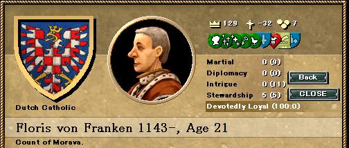 Dirk帝の第2皇子狂人Floris [1143-1192]。 謀臣Aargau伯Gotthardと謀って兄を暗殺するも、破門と父の長命により帝位の継承はならなかった。