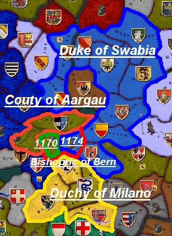 1170 Bern司教領攻略 1173 Swabia公がMilano公にGrison伯領を求めて開戦するも敗退 1174 Swabia公を破りSchweiz伯領獲得