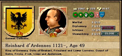 Lower Lorraine公、ドイツ王Rainhard [1121-1174]。 Dirk=Franken帝に真っ先に反抗し10年にわたり戦いを続け、 ついにフランドルの地で行われた決戦に勝利して王位を獲得するも、 その際に負った傷が元で4年後に死去、ドイツの統一は失われた