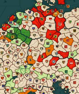 その後もドイツの戦乱は続き、ついにはDirk=Franken帝が簒奪者Lower Rorraine公Reinhard=d'Ardennesに敗れドイツ王位を失うという事態に至りました。しかし、ドイツ王位を獲得したReinhardもフランドルの地で行われた決戦の際に負った傷で床につき、諸侯をまとめる事ができません。